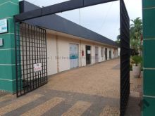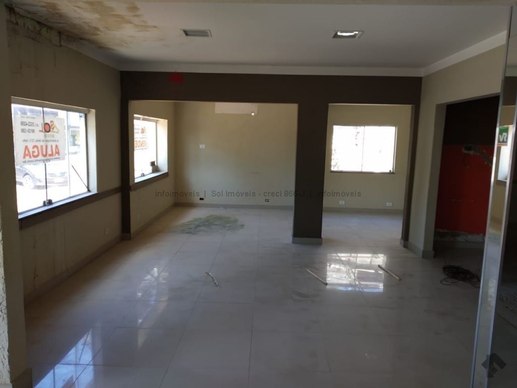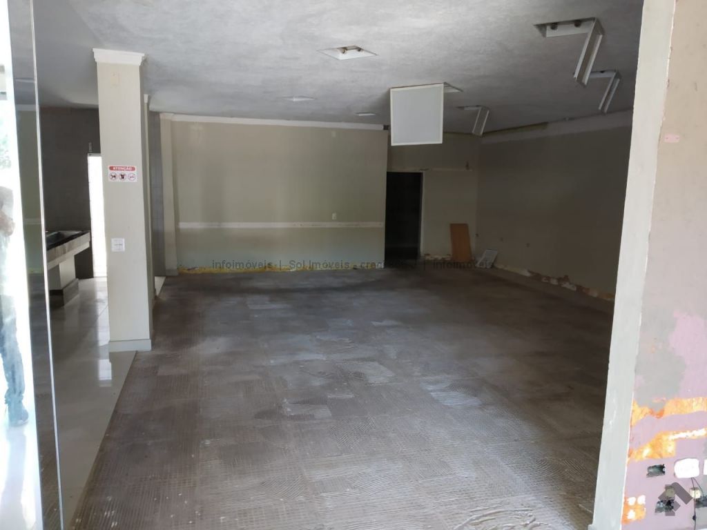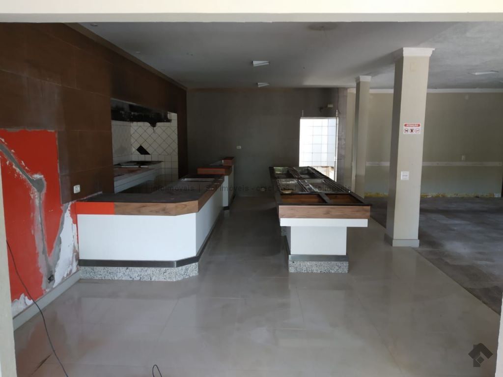 Salão comercial com hall de entrada, banheiros e cozinhas.