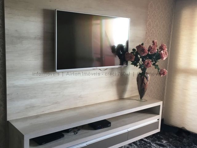 Apartamento grande, com área de lazer completa, hall de entrada, sala de jantar com mesa embutida com quatro cadeiras, sala de estar com painel de TV, 01 suite com ar condicionado e armários embutidos, 02 quartos com a/e (sendo um com cama de casal e criados, cozinha completa, todos os quartos e sala com papel de parede.