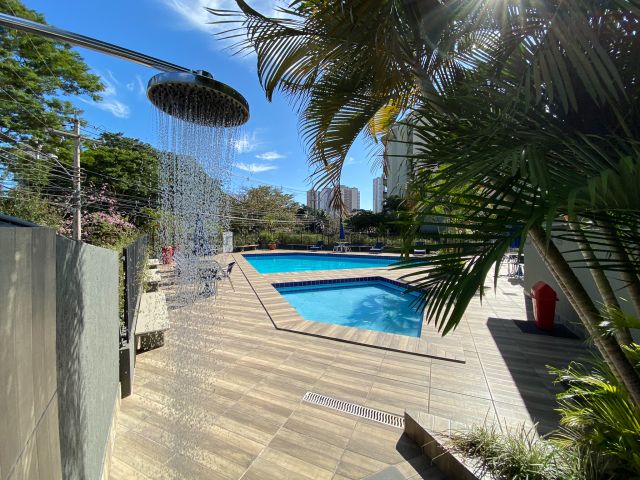 Apartamento climatizado com 1 suíte com sacada, 2 quartos, sala com dois ambientes, cozinha com armários, área de serviço com banheiro, garagem coberta para um carro com possibilidade de locação de mais uma vaga. Quadra e área gourmet.