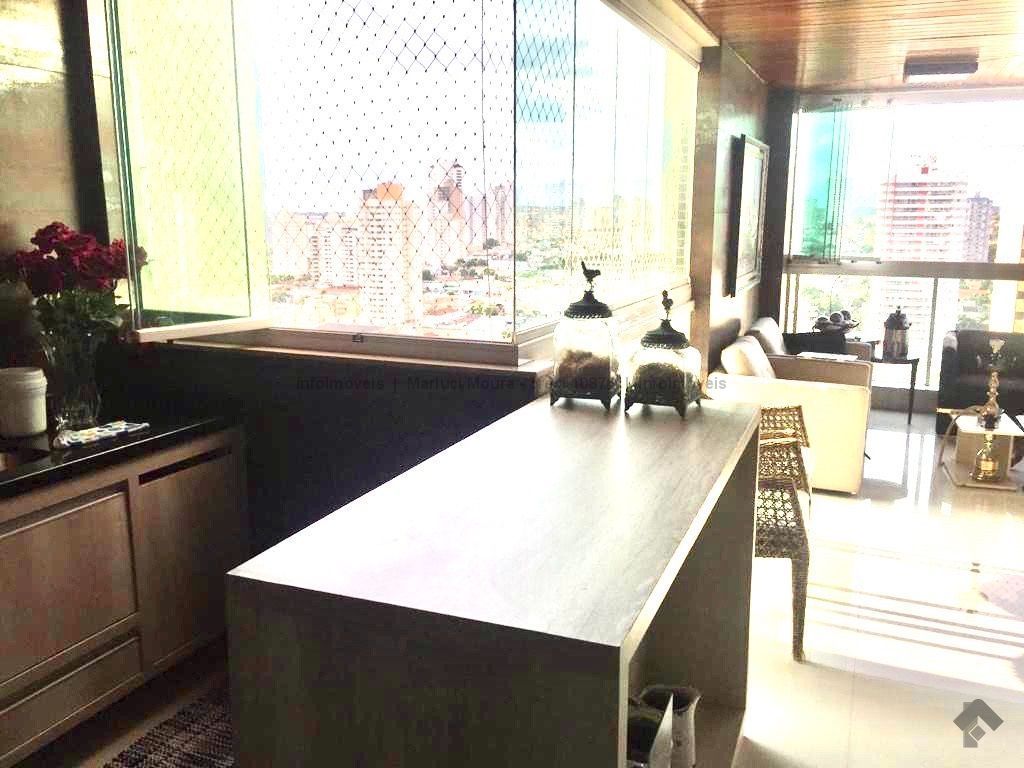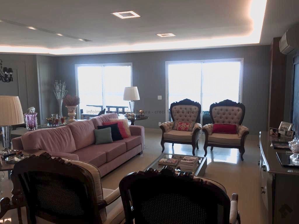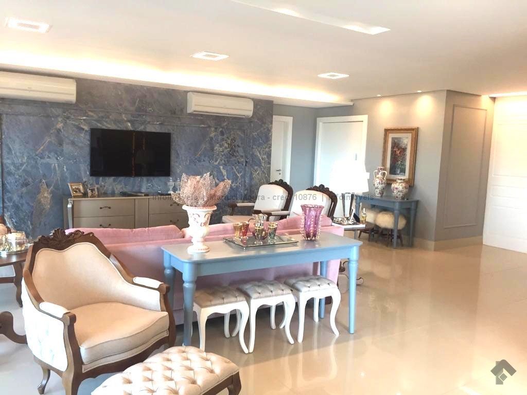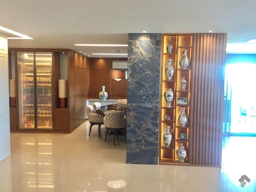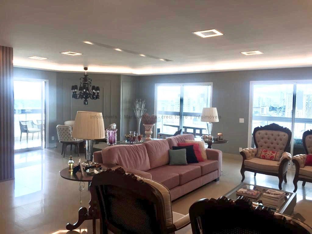 Sala de estar, sala de jantar, varanda extensa com churrasqueira gourmet, lavabo decorado, 3 suítes completas e armários planejados, suíte máster e banheiro suíte máster mais closet completo e varanda sacada, sala íntima, copa e cozinha com armários de 1ª linha planejados, sala de almoço, área de serviço completa, banheiro de serviço, circulação, 2 quartos de empregada, casa de máquinas para ar condicionado. Apartamento todo decorado com armários embutidos de 1ª linha, 04 vagas de garagem. Andar alto e vista maravilhosa desta região central.