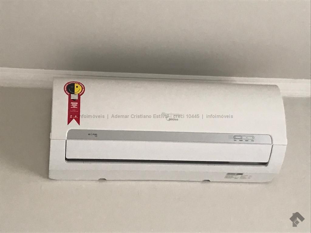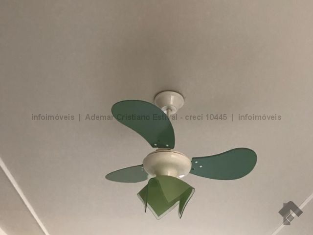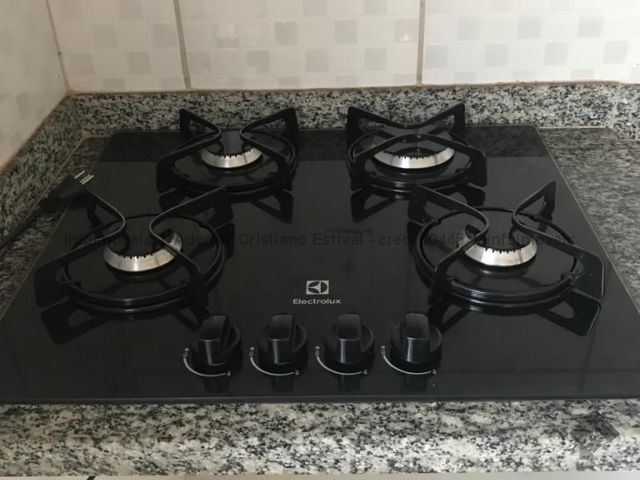 Um apartamento bem espaço, com ventilador de teto, coifa, cooktop 4 bocas, armários e ar condicionado.