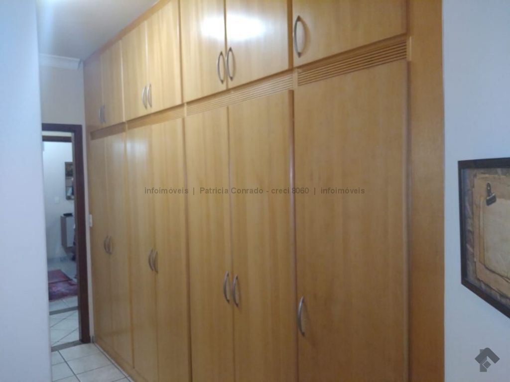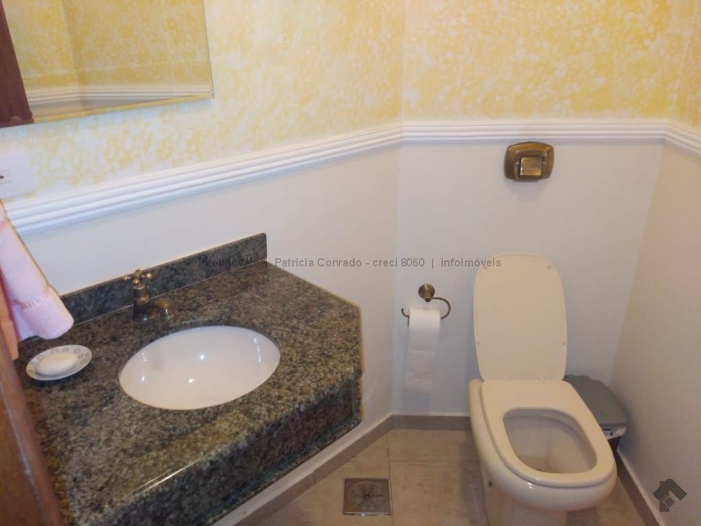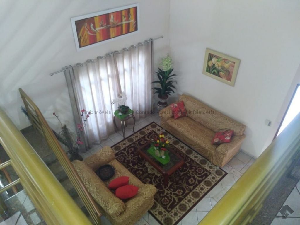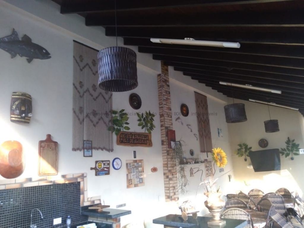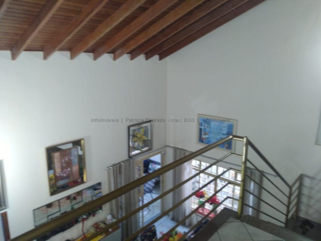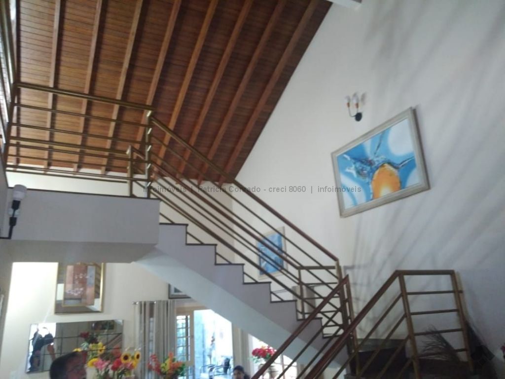 Mezanino com quarto escritório, banheiro e sala de TV embaixo, sala de visita, sala de jantar, lavabo, 2 quartos om armários, 1 suíte com armário e ar condicionado, cozinha planejada, sala de ginástica, área de serviço, quarto de empregada, piscina 3,49 m x 7,86 m com aquecimento, salão de festa para 30 pessoas, área gourmet com churrasqueira, canil, casa com corredores laterais, total 6 banheiros, muito rica em Blindex.