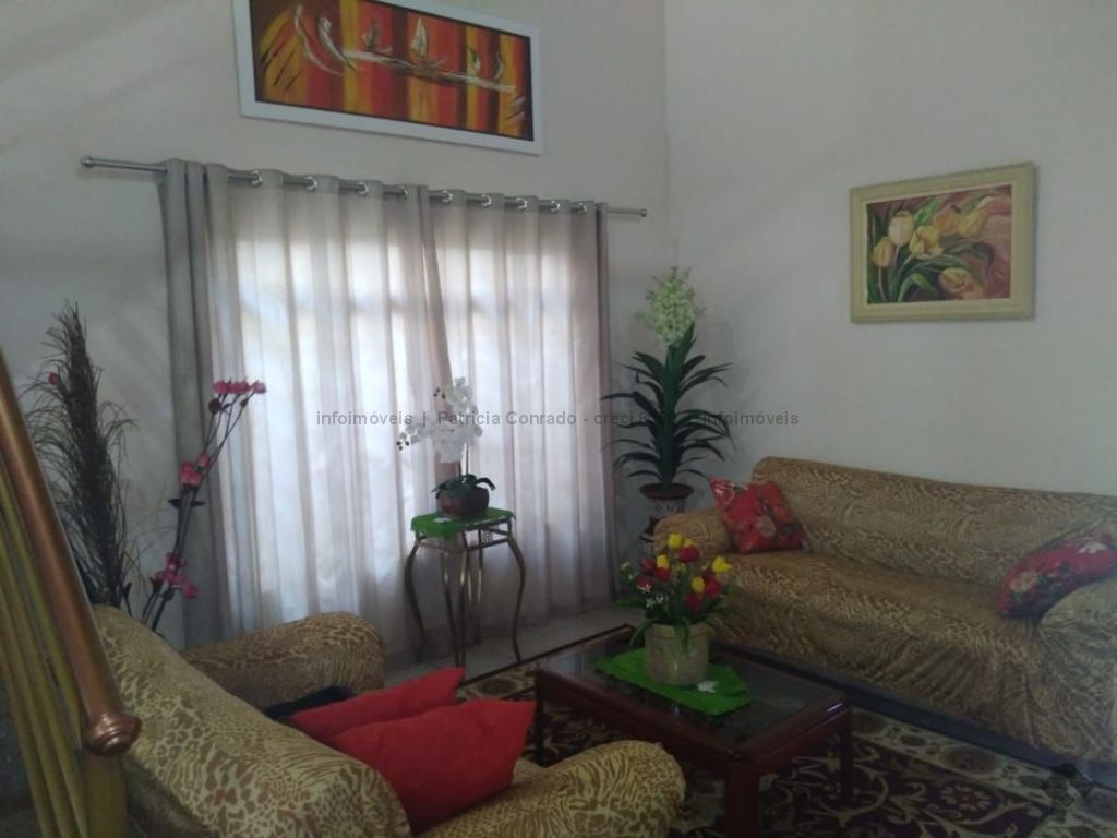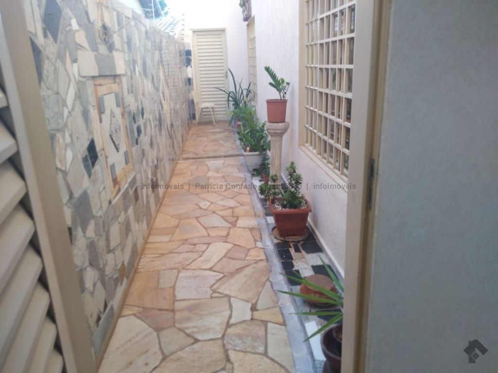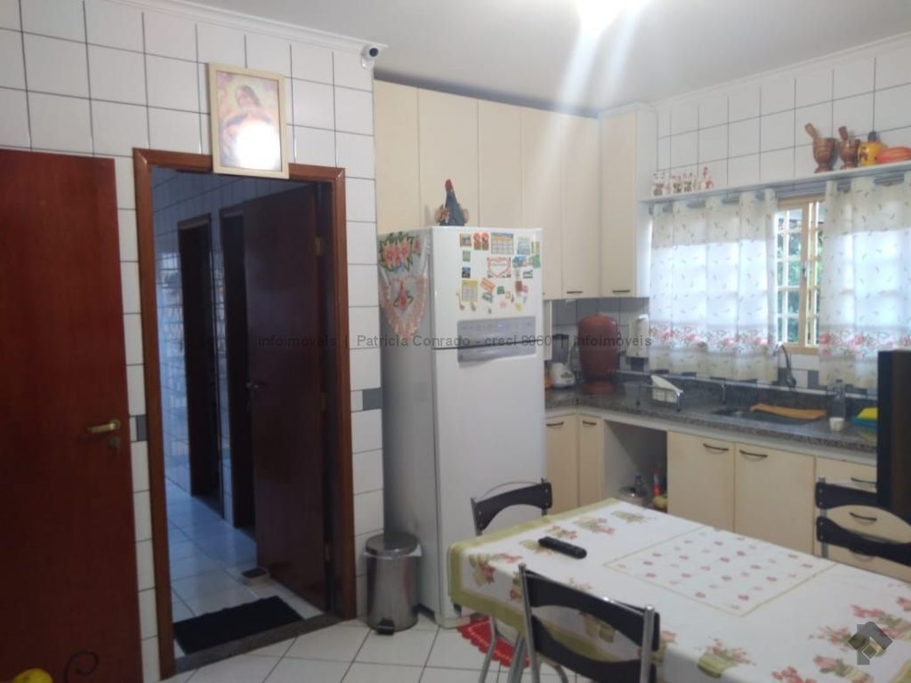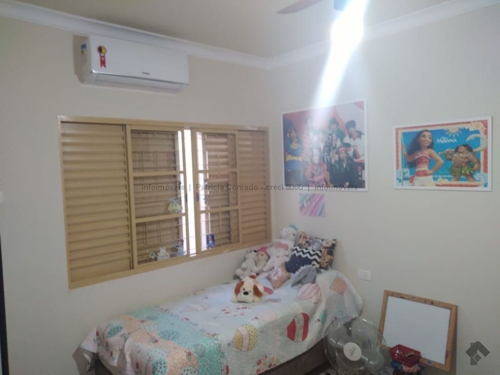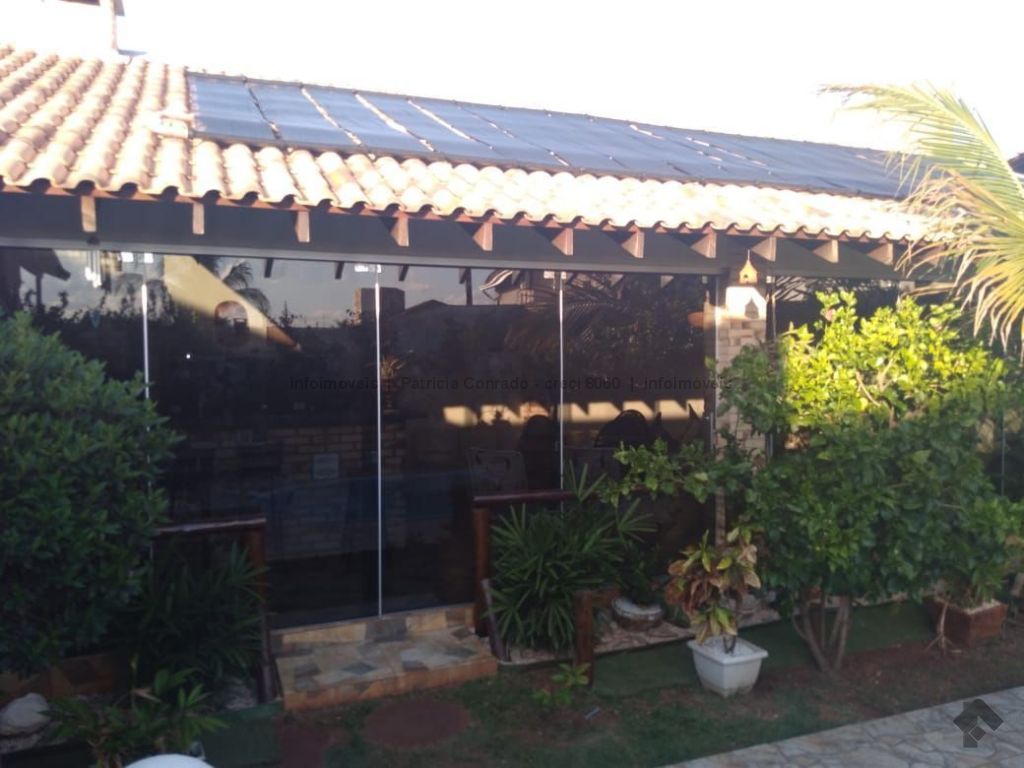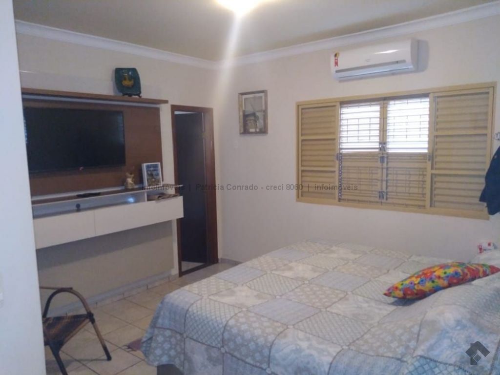 Mezanino com quarto escritório, banheiro e sala de TV embaixo, sala de visita, sala de jantar, lavabo, 2 quartos om armários, 1 suíte com armário e ar condicionado, cozinha planejada, sala de ginástica, área de serviço, quarto de empregada, piscina 3,49 m x 7,86 m com aquecimento, salão de festa para 30 pessoas, área gourmet com churrasqueira, canil, casa com corredores laterais, total 6 banheiros, muito rica em Blindex.