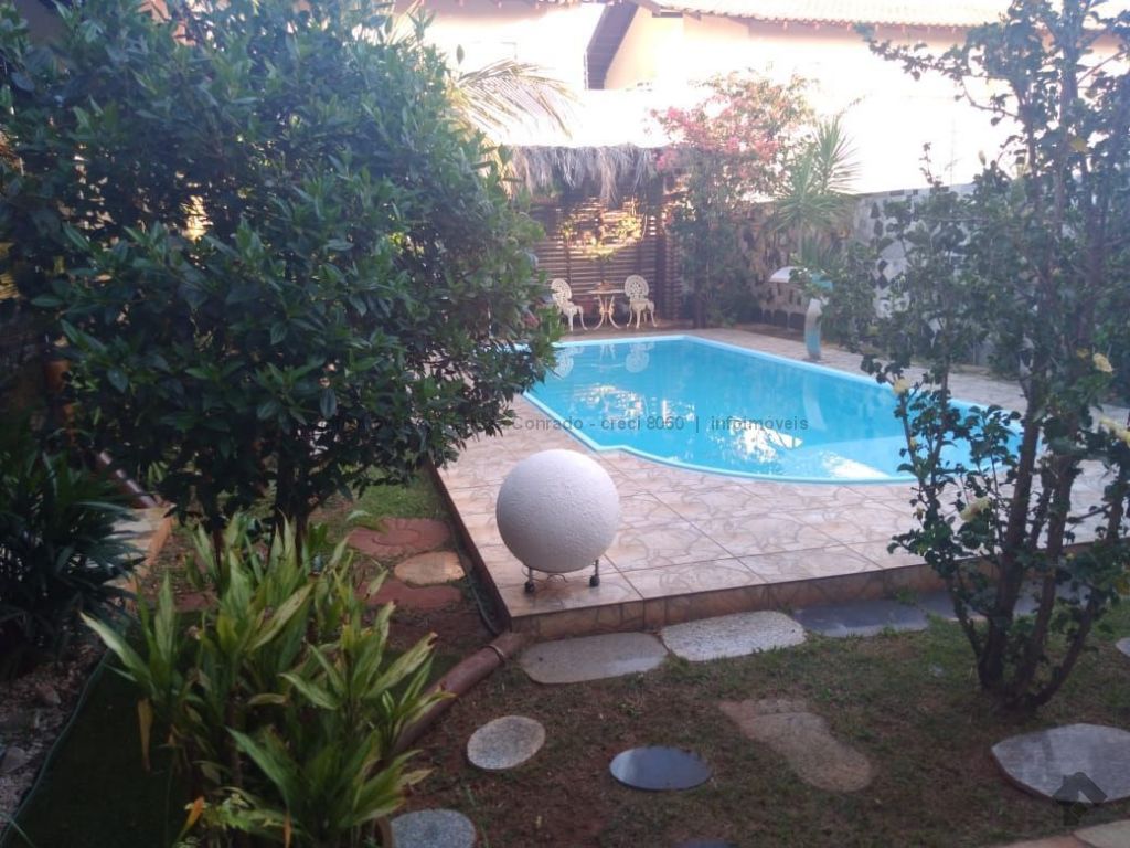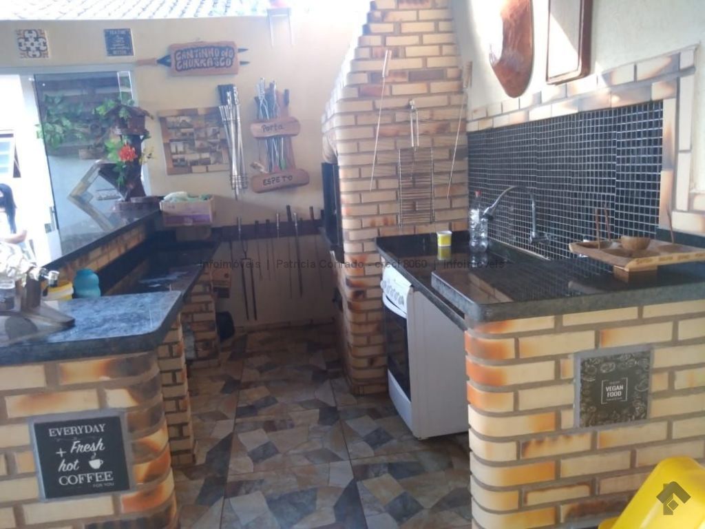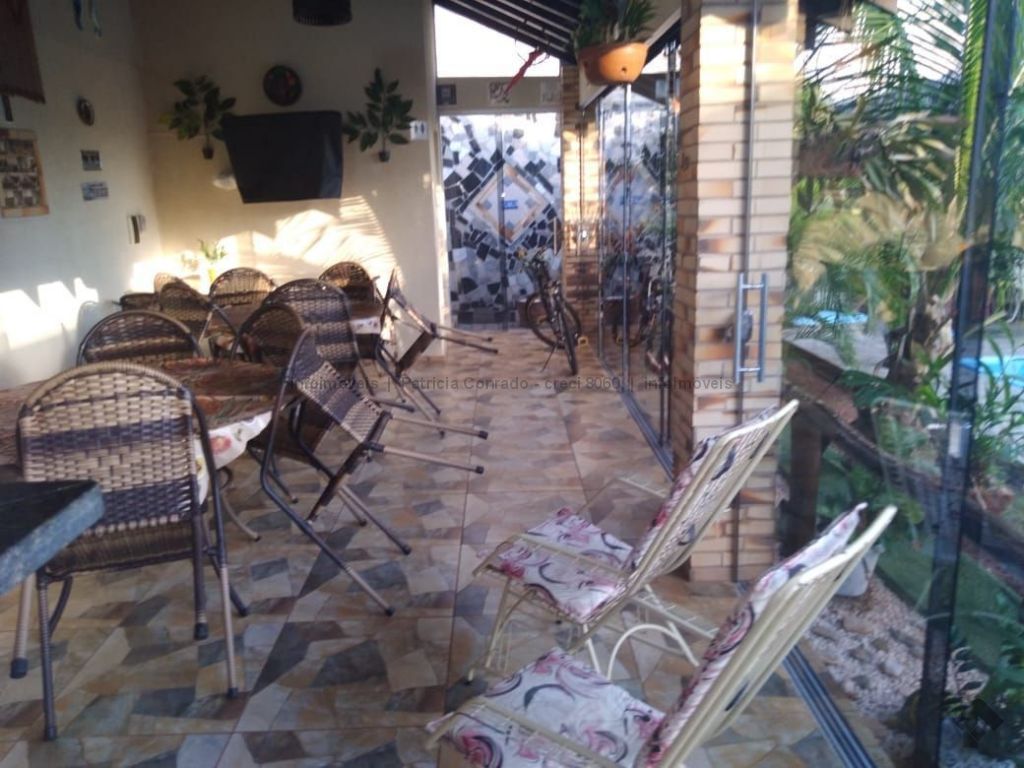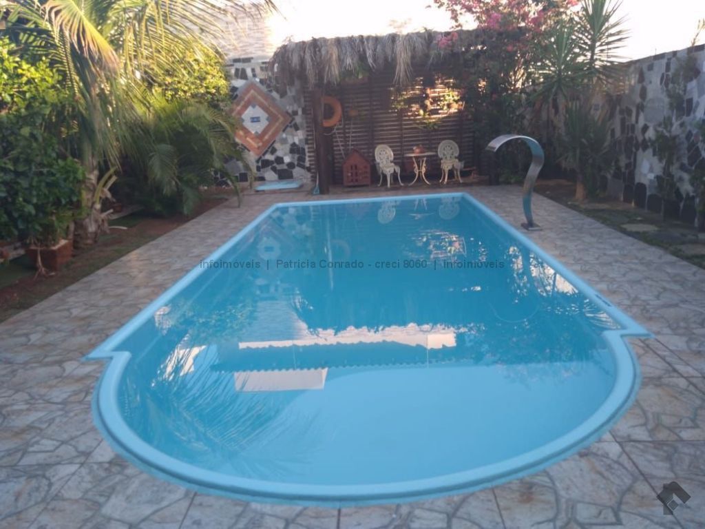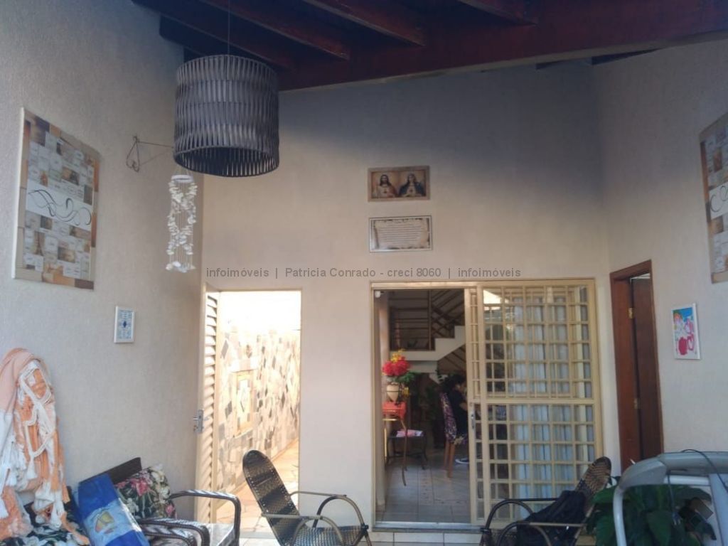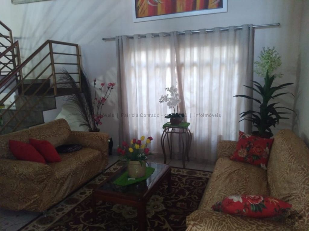 Mezanino com quarto escritório, banheiro e sala de TV embaixo, sala de visita, sala de jantar, lavabo, 2 quartos om armários, 1 suíte com armário e ar condicionado, cozinha planejada, sala de ginástica, área de serviço, quarto de empregada, piscina 3,49 m x 7,86 m com aquecimento, salão de festa para 30 pessoas, área gourmet com churrasqueira, canil, casa com corredores laterais, total 6 banheiros, muito rica em Blindex.