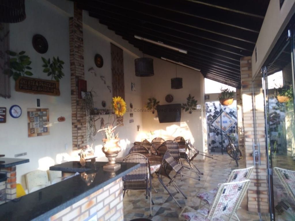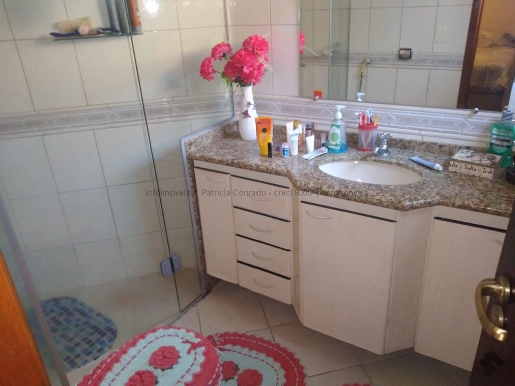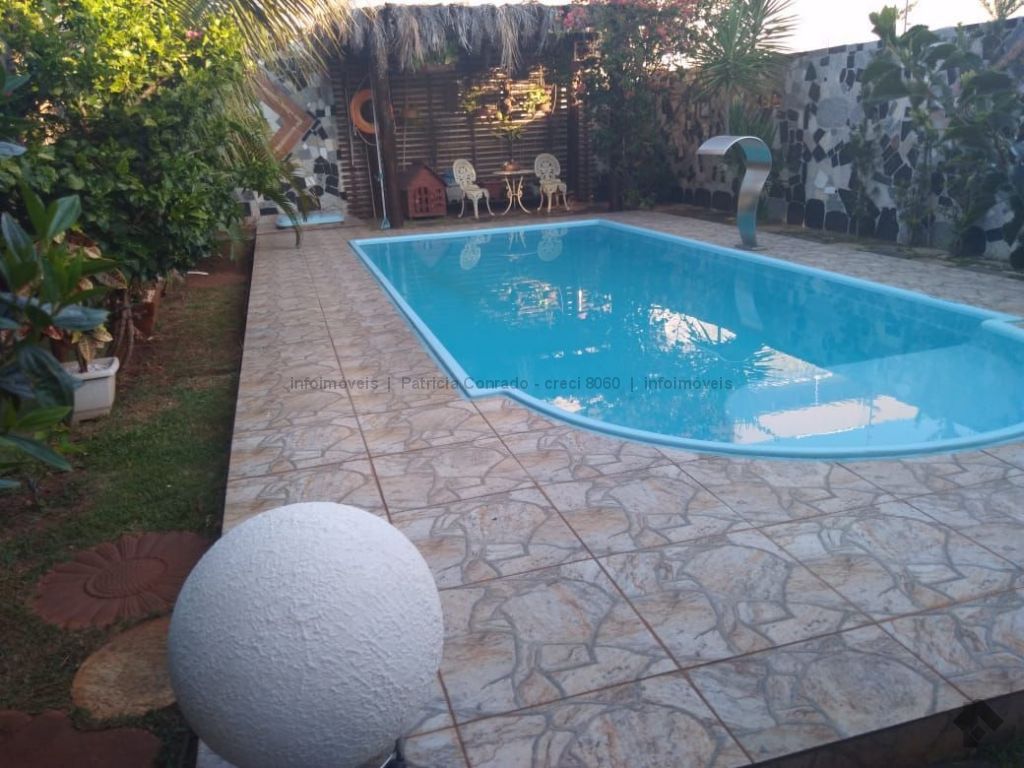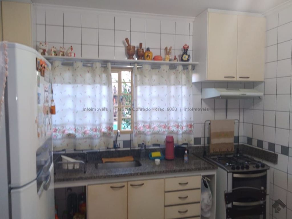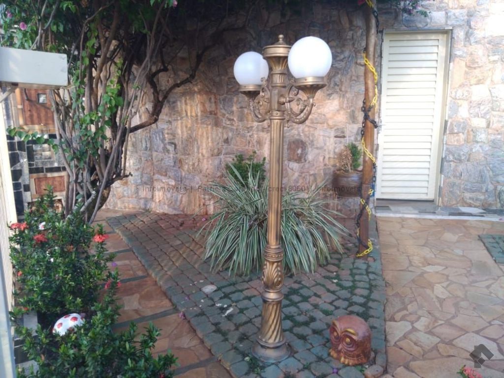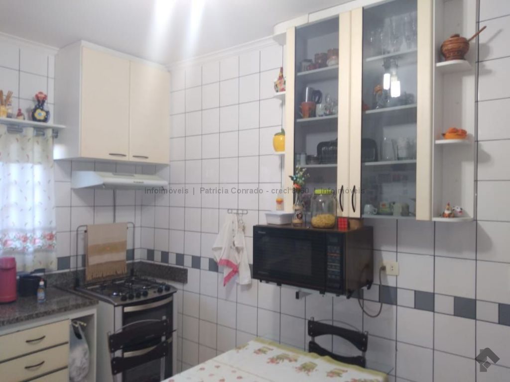 Mezanino com quarto escritório, banheiro e sala de TV embaixo, sala de visita, sala de jantar, lavabo, 2 quartos om armários, 1 suíte com armário e ar condicionado, cozinha planejada, sala de ginástica, área de serviço, quarto de empregada, piscina 3,49 m x 7,86 m com aquecimento, salão de festa para 30 pessoas, área gourmet com churrasqueira, canil, casa com corredores laterais, total 6 banheiros, muito rica em Blindex.