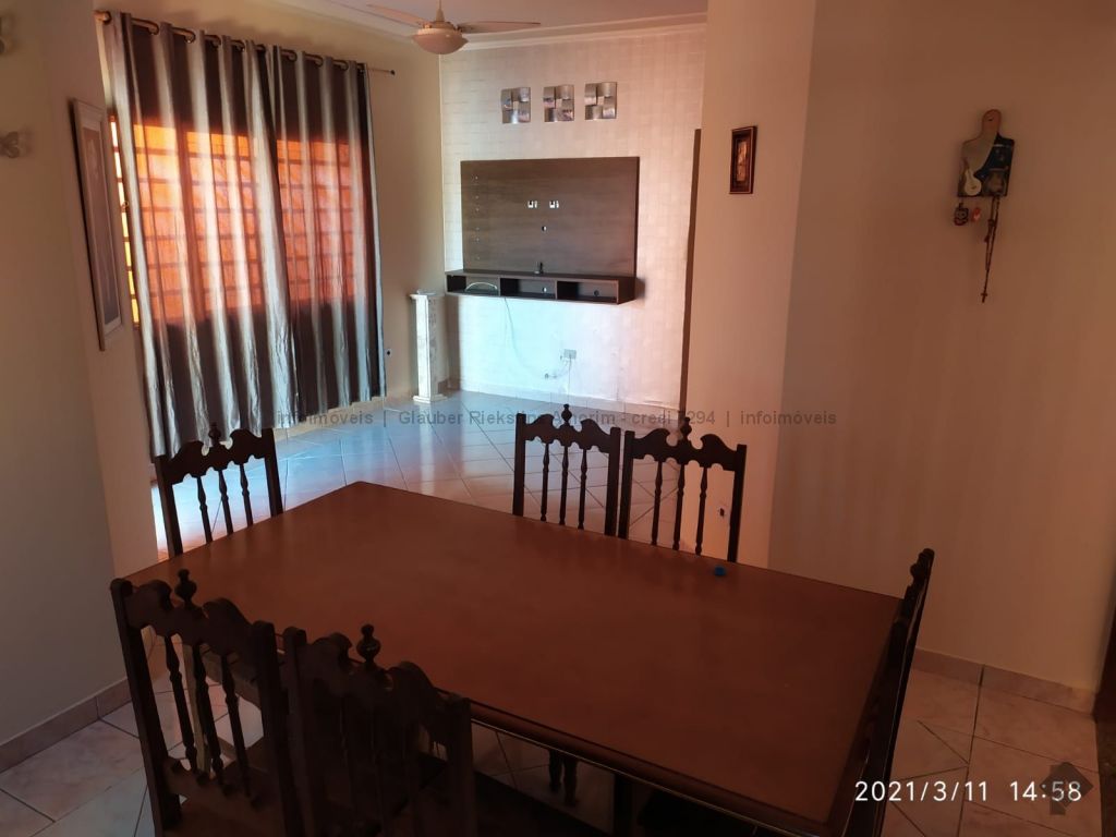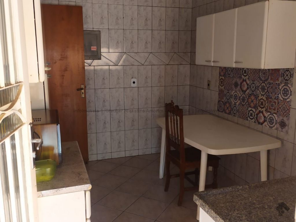 Sala com 2 ambientes, 2 quartos (1 com armário), suíte com armário, banheiro social, cozinha, área de serviço, varanda no fundo com churrasqueira, dispensa, garagem.