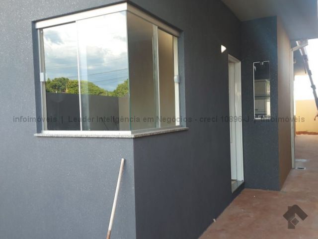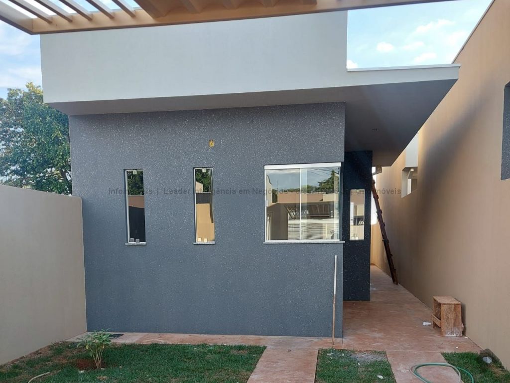 Lindo imóvel novo, contendo sala, cozinha, dois quartos, banheiro social, área de serviço coberta, espaço gramado ao fundo e garagem com portão de elevação.