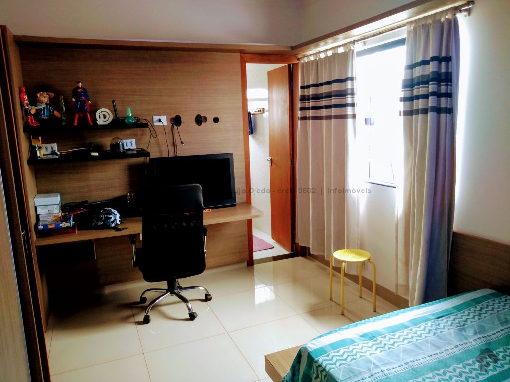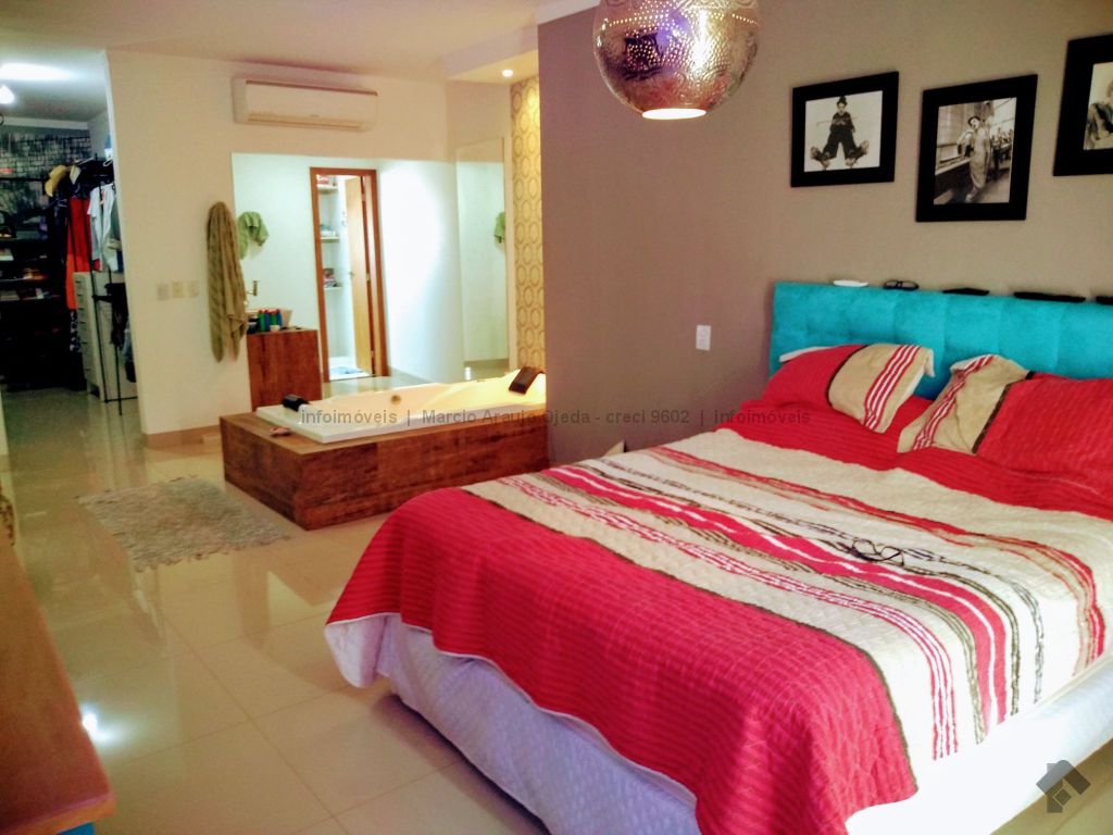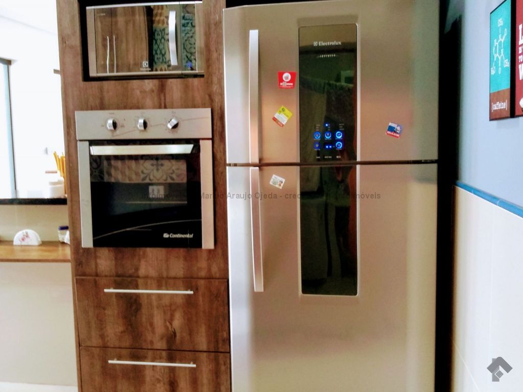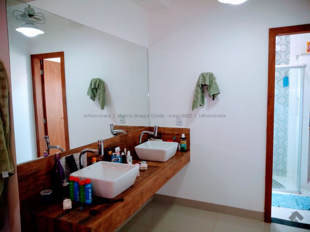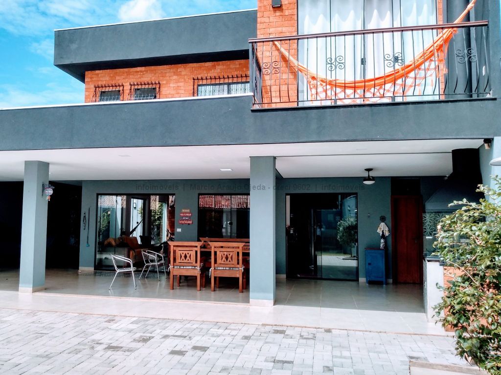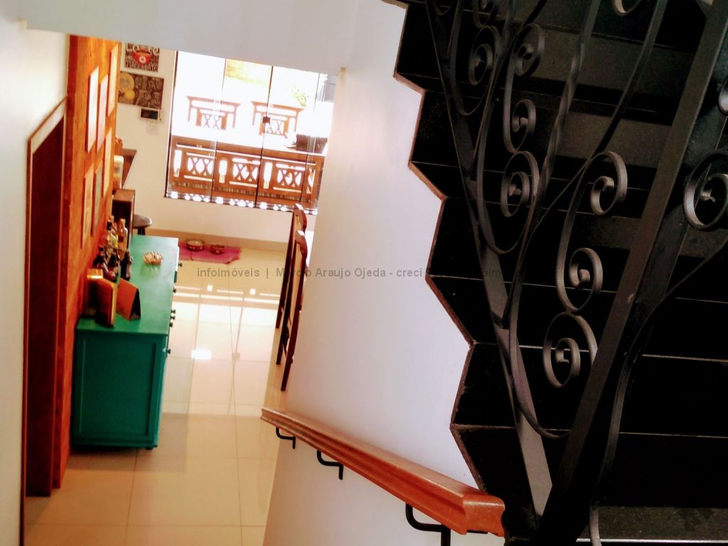 Na parte inferior conta com, sala ampla para 3 ambientes, lavabo, academia, com ar condicionado, cozinha com móveis planejado rico em pedras, incluindo geladeira, cooktop, forno elétrico embutido, micro-ondas todos em inox, lavanderia com armários, wc serviço, área gourmet com móveis planejado e com churrasqueira, inclui TV e um cooktop, ampla varanda, garagem para até 5 veículos, sendo 2 coberta. Parte superior: 3 suítes todas com ar condicionado, uma sendo suíte master com closet e com hidro, cubas suspensas individuais, e com sacada. Sistema de segurança com cerca elétrica e câmeras, todo imóvel com sistema de aquecimento.