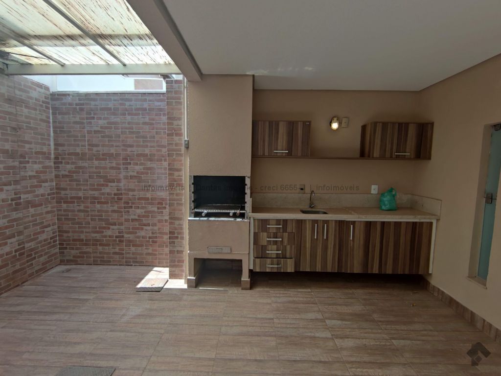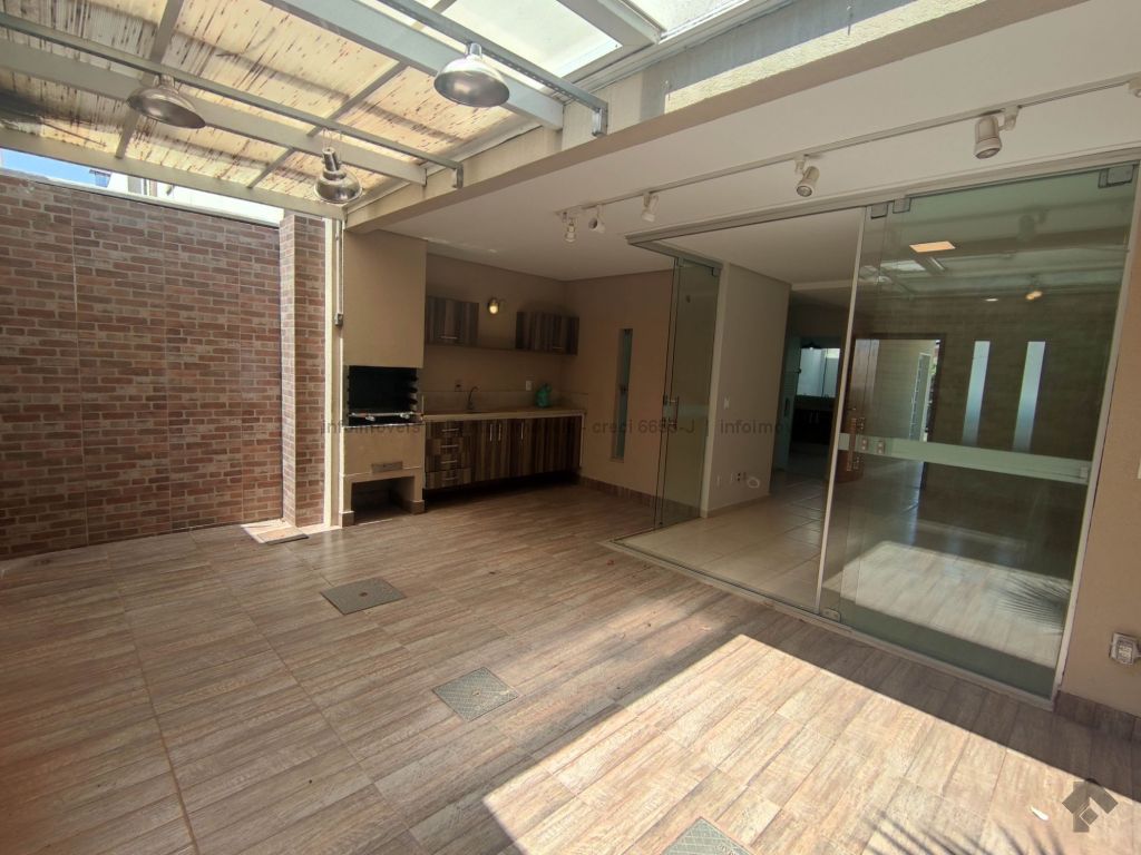 Sobrado em condomínio, com uma suíte com armários mais dois quartos, sacada, sala integrada com varanda gourmet coberta e retrátil, cozinha com alguns armários e vaga de garagem privativa.