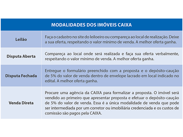 Os imóveis podem ser adquiridos de quatro formas, conforme quadro abaixo: leilão, licitação fechada, licitação aberta ou venda direta. Todas as unidades já possuem garantia da documentação regular e as contas de condomínio e IPTU quitadas até a data da compra.