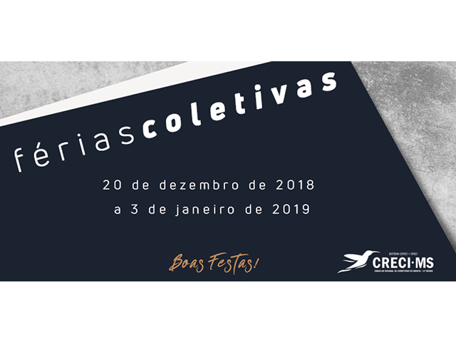 Entre os dias 20 de dezembro de 2018 e 3 de janeiro de 2019, o expediente no CRECI-MS estará suspenso em razão das férias coletivas. O atendimento será restabelecido no dia 4 de janeiro de 2019, às 8h00, nas sub sedes em Dourados e Três Lagoas. Contudo, na SEDE do CRECI-MS no dia 4 de janeiro de 2019 haverá apenas EXPEDIENTE INTERNO e retornando suas atividades de atendimento ao público no dia 7 de janeiro, segunda-feira, às 8h00.