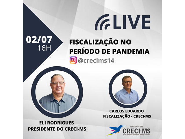 O tema será “Fiscalização no período de pandemia”. O bate-papo será comandado pelo presidente do CRECI-MS, Eli Rodrigues, dando continuidade à primeira live, que abordou os direitos e deveres do corretor de imóveis e a fiscalização do CRECI.